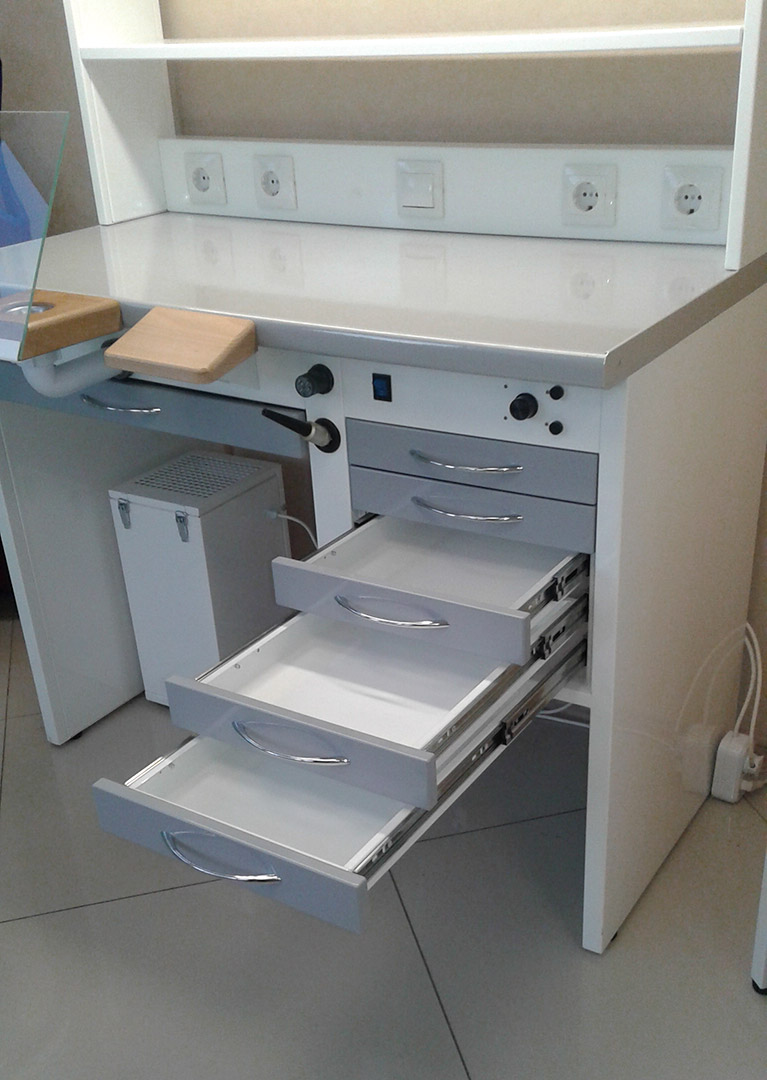 Стол для оборудования рабочего места зубного техника. Оснащается обдувочным соплом, светильником, регулятором мощности вытяжного устройства, подлокотниками.