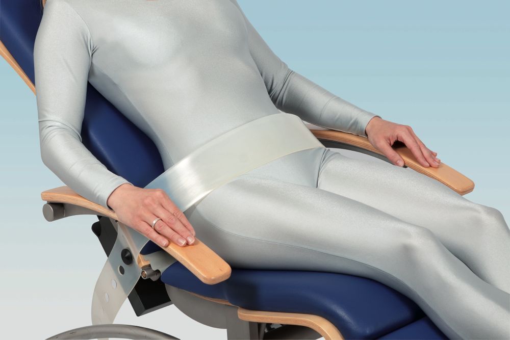 В положении полулежа силиконовый ремень для живота предотвращает соскальзывание пациента вниз. Особенно мягкий материал облегает тело без излишнего сдавливания.