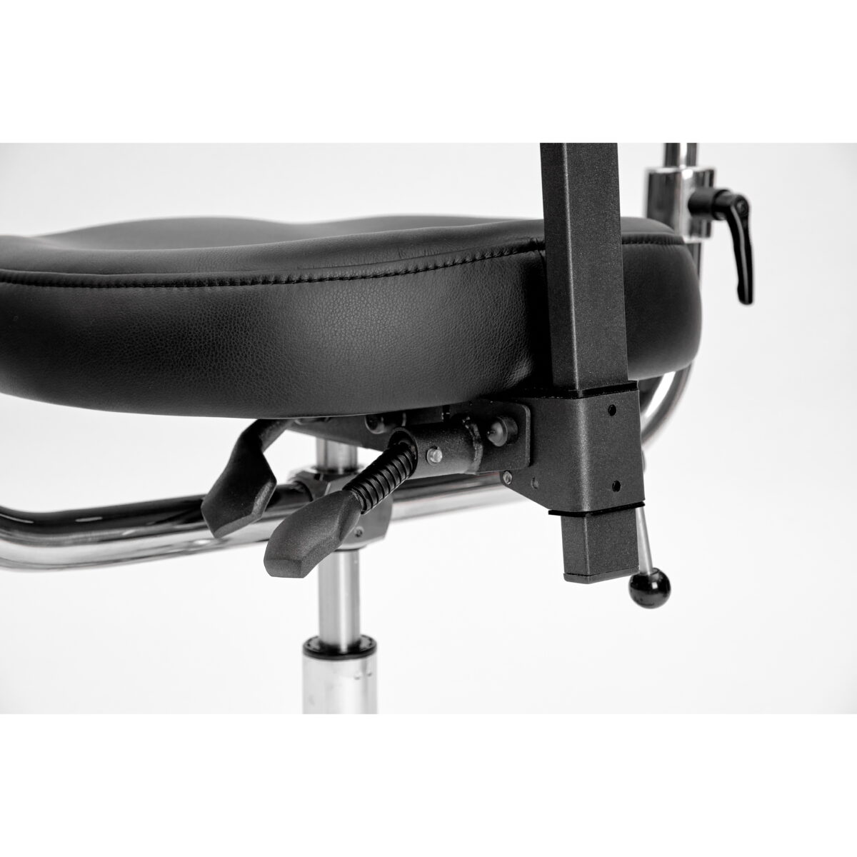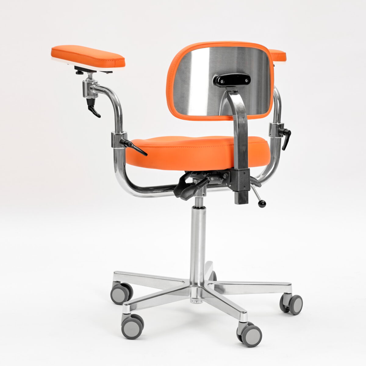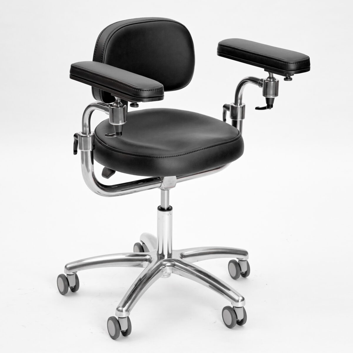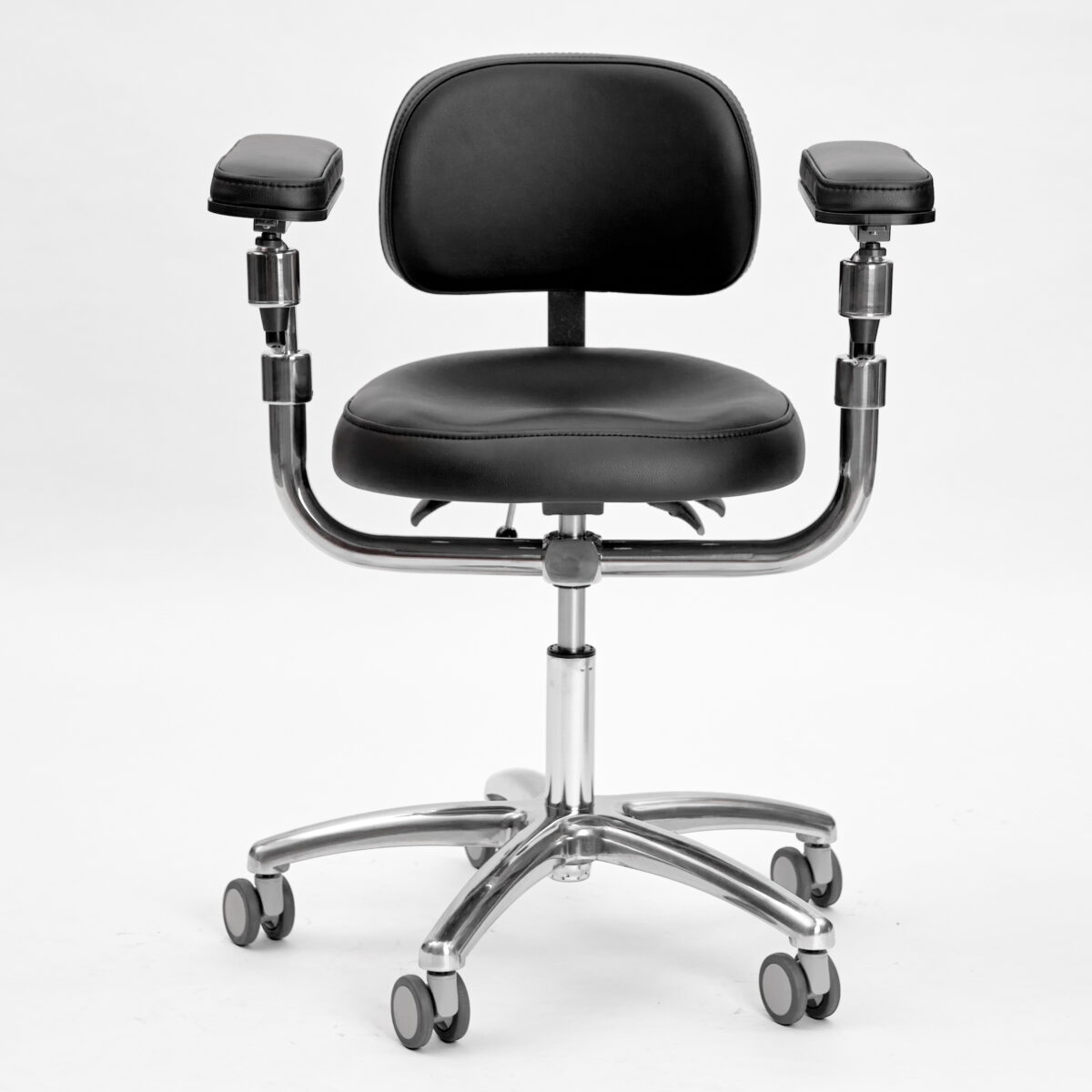 Эргономичный стул для работы с микроскопом. Подлокотники регулируются по высоте и углу наклона. Дополнительно имеют горизонтальную регулировку.